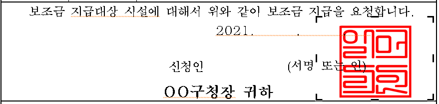 한글 문서에 서명, 인 등이 뒤에 그대로 비추면서 자연스럽게 찍히는 것 보이시죠...