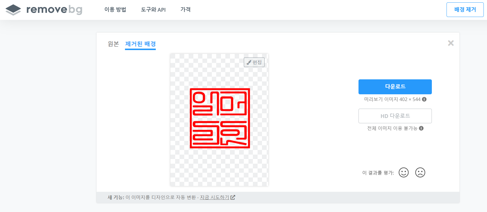 1. 도장을 드래그해서 그대로 업로드하고 변환을 하면 아래처럼 바로 배경이 투명이미지로 만들어집니다.