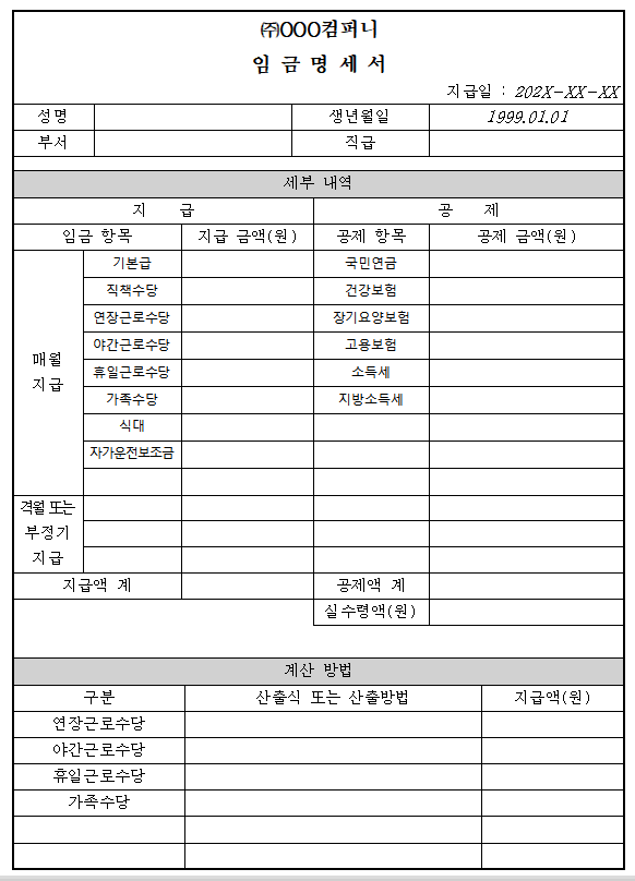 (기재사항이 모두 포함되어 있다면 사업장에서 자율적으로 임금명세서 서식을 만들어서 사용 가능)