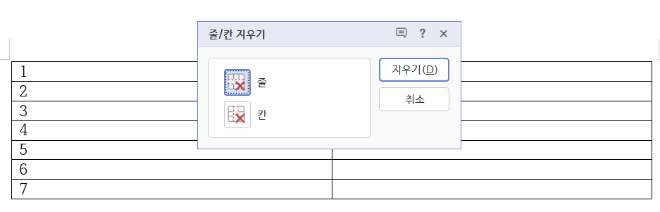 위와 거의 같은 기능이지만 이 경우는 줄을 삭제하는지 칸을 삭제하는지 확인하고 삭제할 수 있습니다.