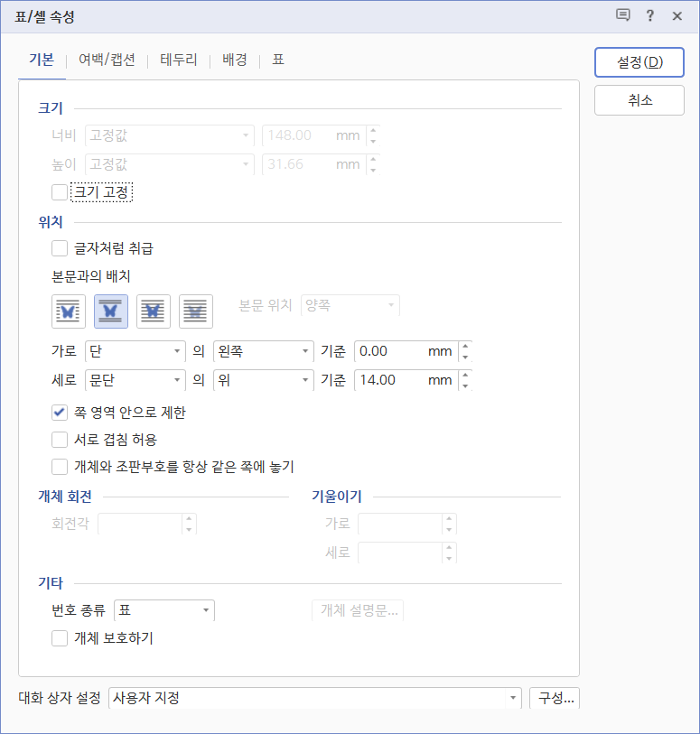 - 표 전체를 선택하고, 글자처럼 바꾸기 등 설정을 바꾸고 싶은 경우에는 F11을 누르고 P를 선택하면 됩니다.