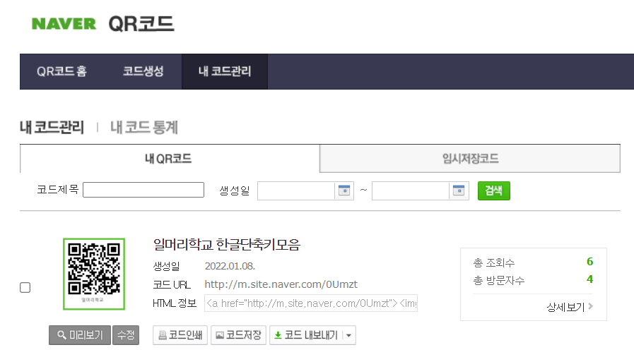 2. 내 코드관리 메뉴엘 들어가보면 아래 코드URL이 있습니다.