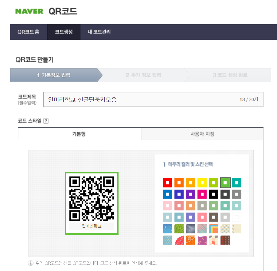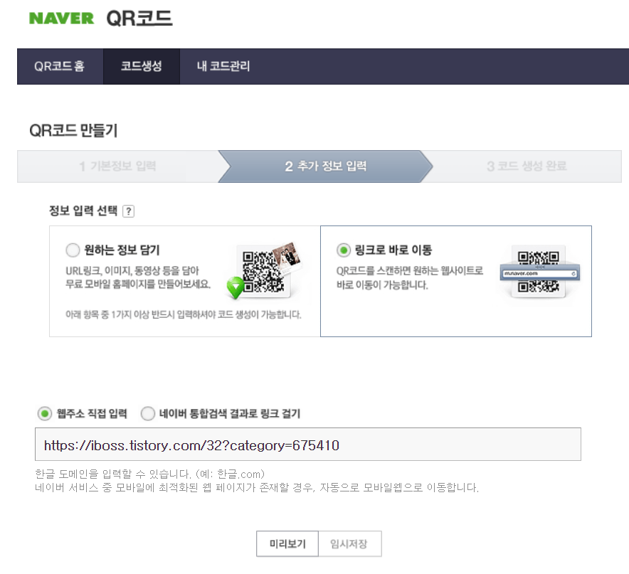 1. 네이버QR코드 만들기에 링크로 바로 이동하는 메뉴에 하단에 긴 주소URL를 입력합니다.