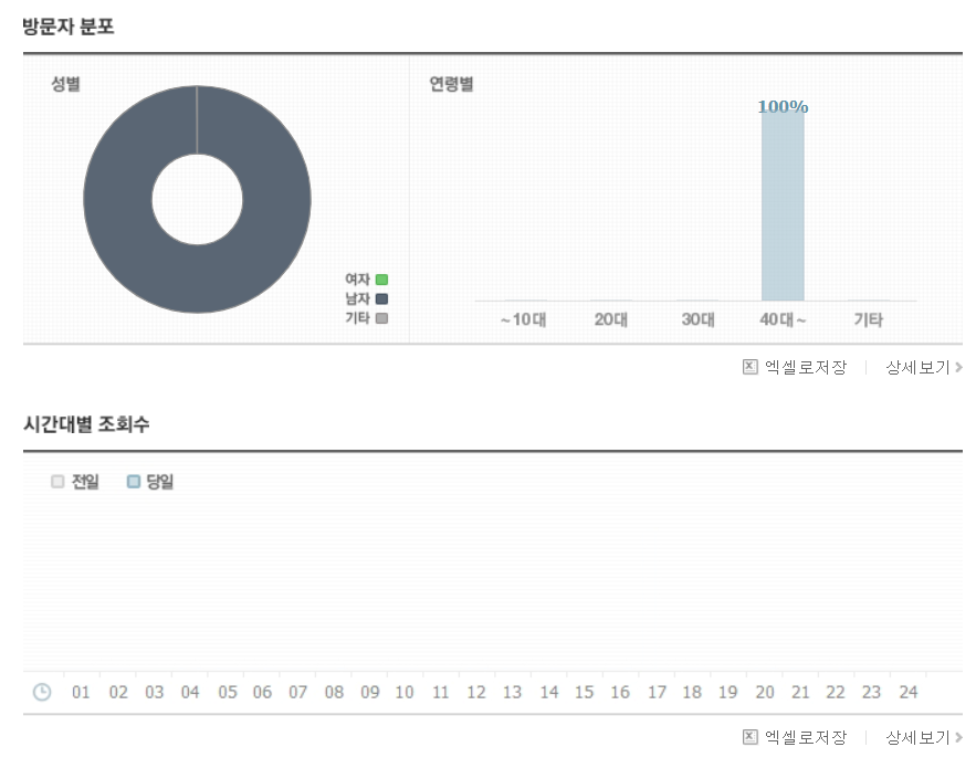 - 방문트렌드, 남녀, 나이 방문자 정보, 시간대별 조회수 등도 한눈에 파악이 가능합니다.