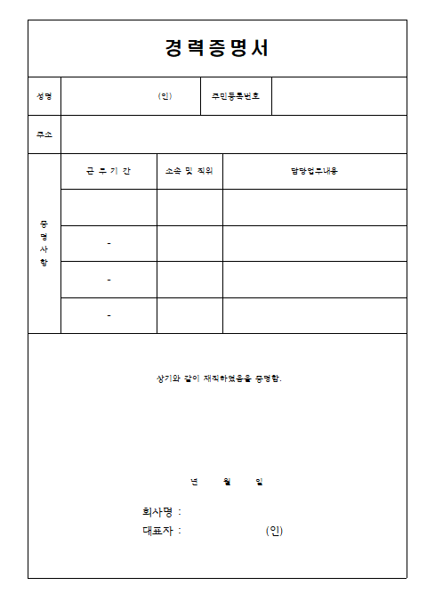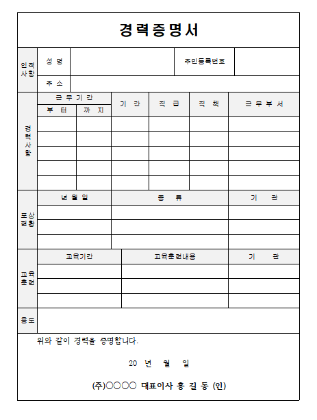 ※ 경력증명서 양식이 없는 경우는 아래 첨부파일을 활용하기 바랍니다.