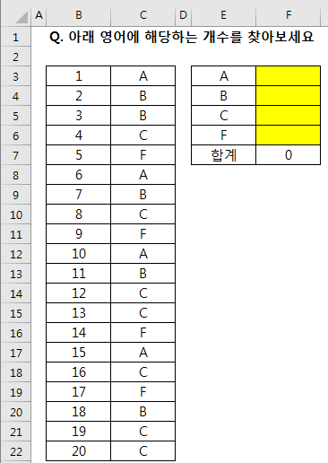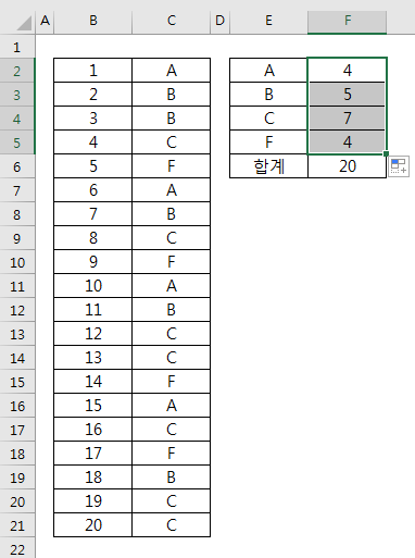 예를 들어 20명의 학생 중에서 A, B, C, F 학점을 받은 학생의 수를 쉽게 파악하는 과정을 예로 들어 보겠습니다.