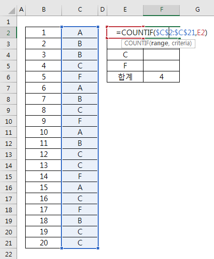 =COUNTIF($C$2:$C$21, E2)