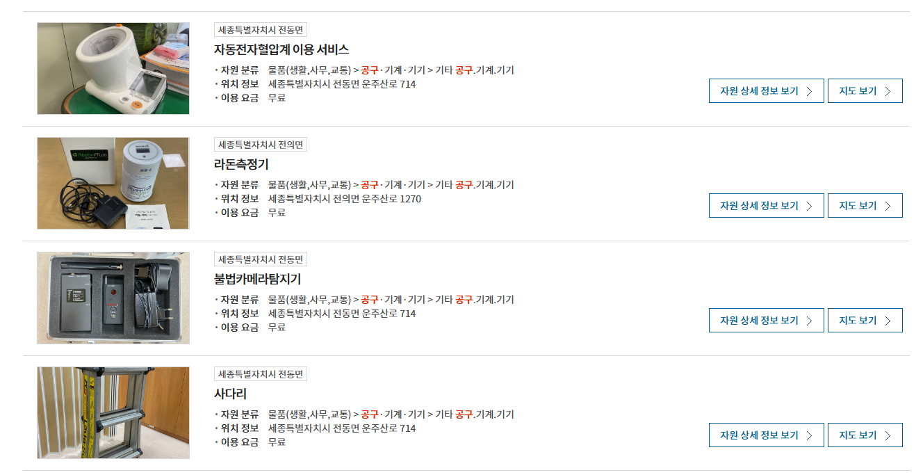 예를 들어 "공구"라고 검색하면 사다리부터 혈압계, 라돈측정기까지 모두 무료로 빌려볼 수 있더라구요. 오~~ 좀 괜찮죠.