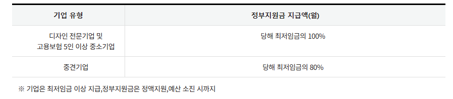 - 기업: 디자인 전문기업 또는 고용보험 피보험자 수 5인 이상의 중소·중견기업으로, 공고일 기준 만 19세 이상 34세 이하의 청년 디자이너를 채용한 기업