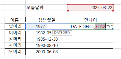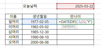 2. DATEDIF 함수를 적용하고 아래처럼 (생년월일, 오늘날짜, "Y") 셀값을 입력합니다.