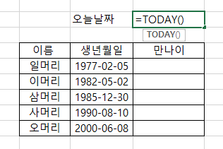 이렇게 수식을 짜두면 오늘 날짜로 반영된 만나이를 바로바로 파악할 있습니다.